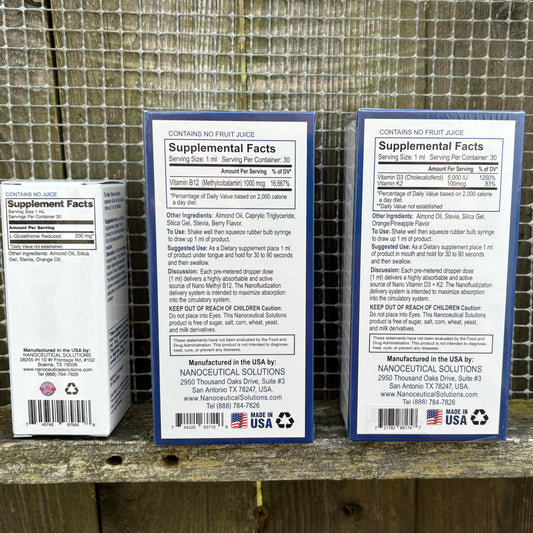 Nanosized Liquid Drops - Glutathione, Vit D3 + K2, or Methyl B12 - by Nanoceutical Solutions